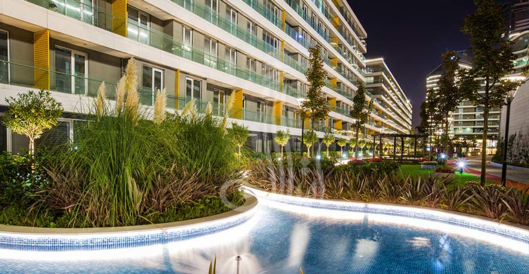 - في المجمع يمكنك ركوب دراجتك على مسارات الدراجات حيث تلتقي المياه بالخضرة، أو تمشي على طول المسابح المزخرفة، فالمياه والبرك تأخذ حيزاً كبيرة من مساحة المشروع.