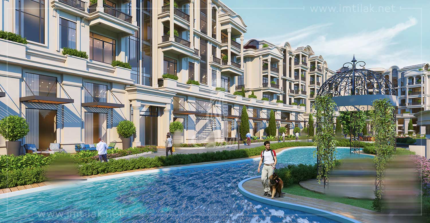 - حديقة واسعة ومسطحات مائية، وخدمات اجتماعية وترفيهية متنوعة، تضفي على أجواء الإقامة في المشروع طابعاً عائلياً بمقاييس عالية من الأمان.