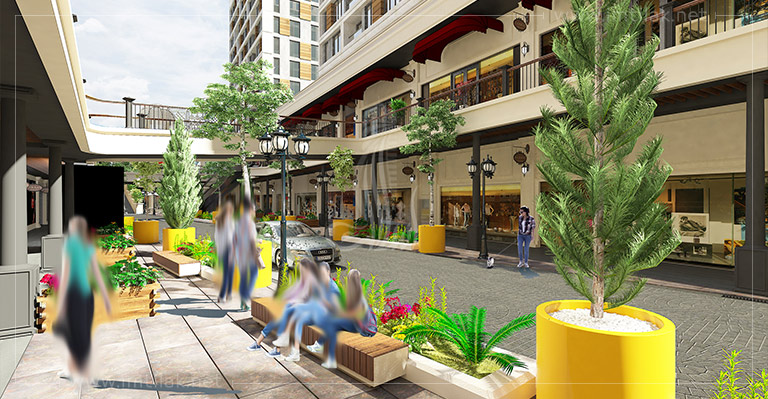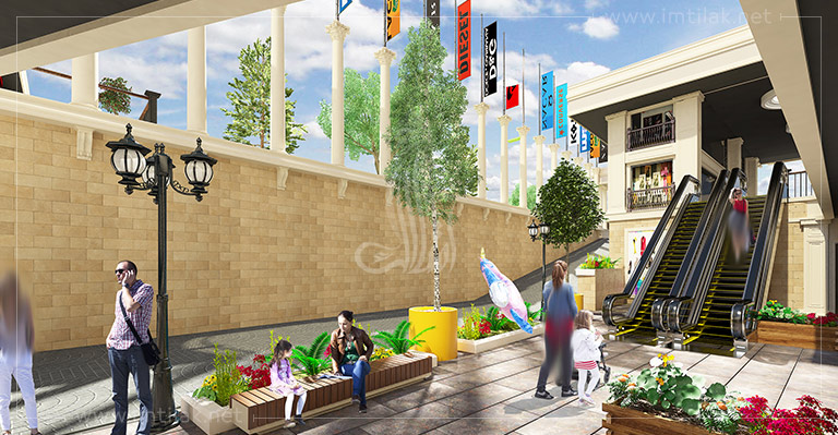 يوجد سوق "بازار" يحوي 56 متجراً مكون من طابقين في أسفل المباني.