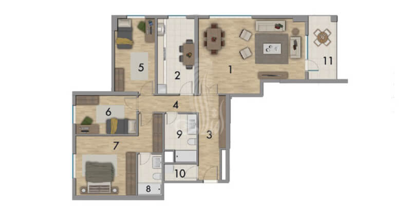 - ورغبة بتحقيق السعة والانشراح في مساحات الشقق، تم تصميمها وتقسيم مساحاتها بين غرفتين وصالة و4 غرف وصالة بالإضافة لشقق الدوبليكس والشقق ذات الحدائق المستقلة.