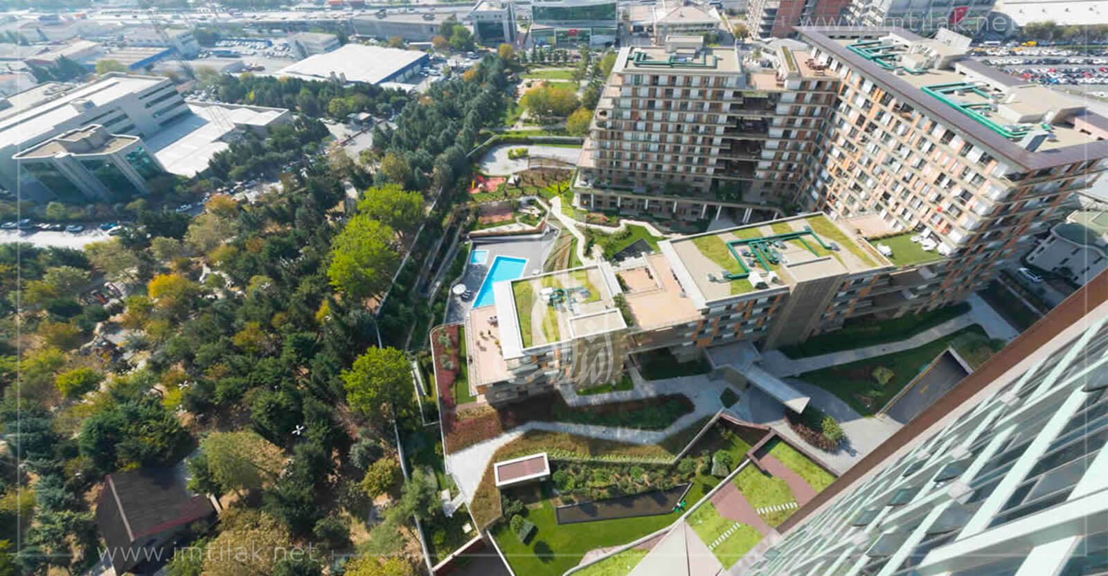 - Комплекс характеризуется просторными зелеными насаждениями, изобилующими деревьями и скоординированными садами, которые добавляют больше красоты и спокойствия в жизнь жильцов, а также наличием зеленых террас и балконов с потрясающим видом на зеленые насаждения.