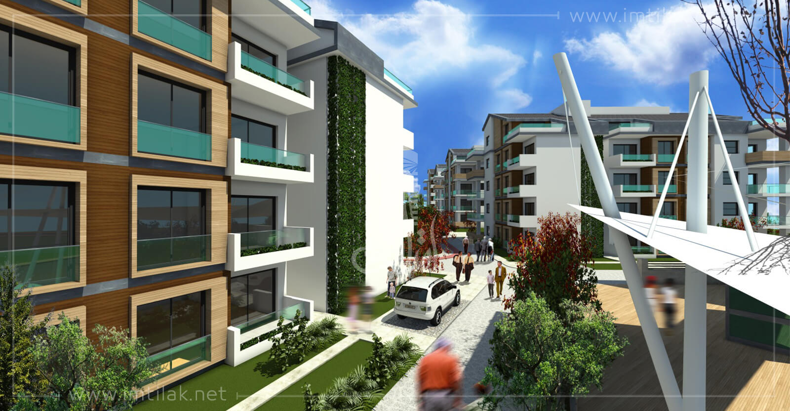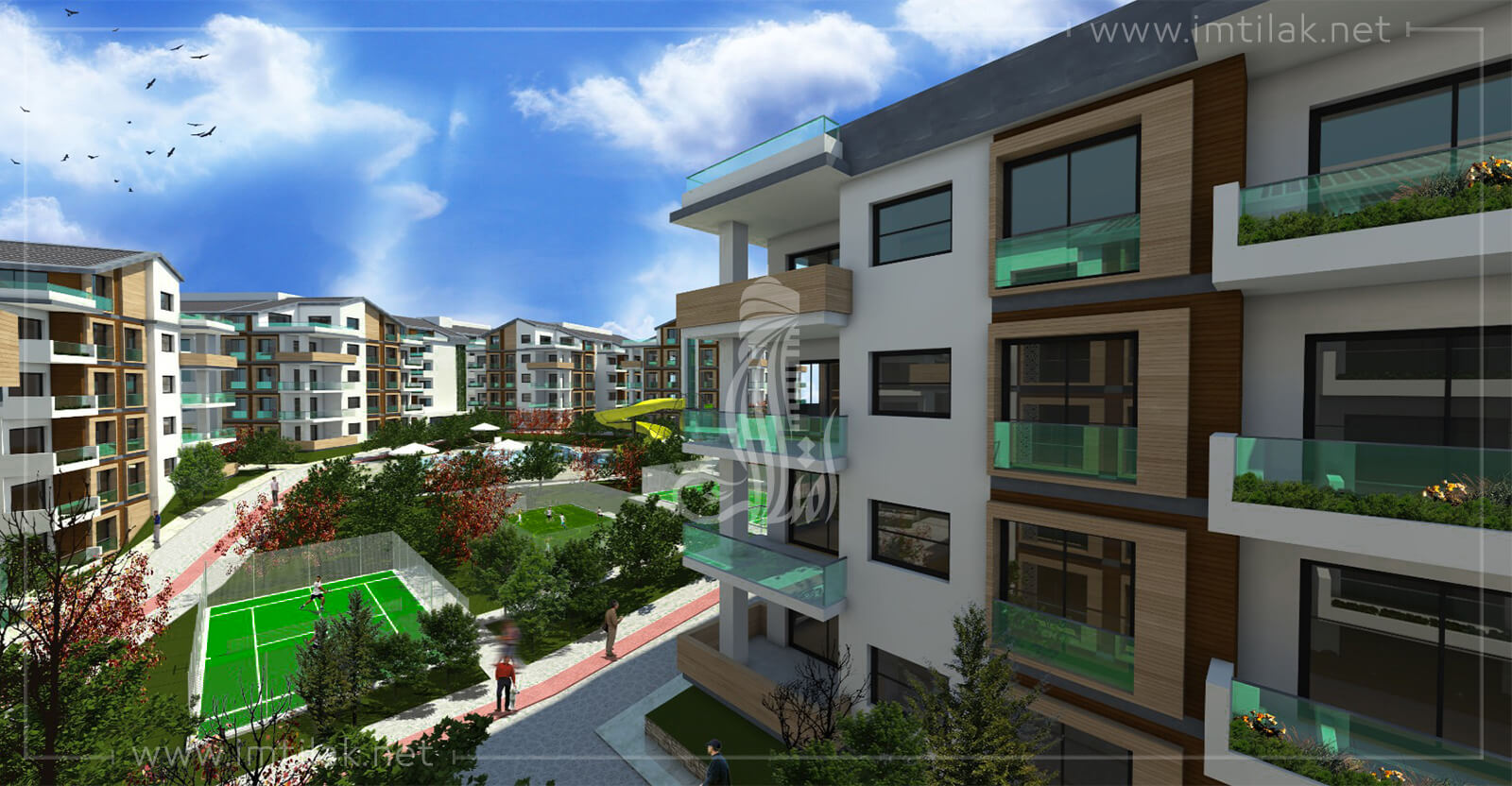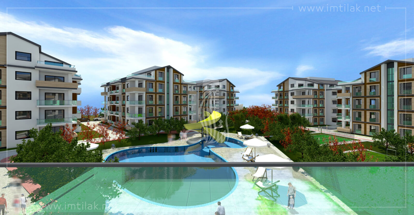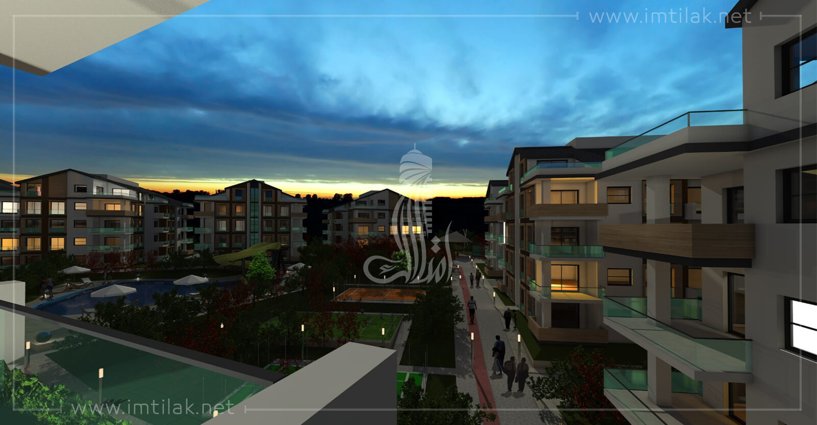 - Снаружи проект характеризуется красивым частным дизайном, его здания окружены садом с характерным дизайном, с бассейном, окруженным пешеходными дорожками и детскими игровыми площадками.