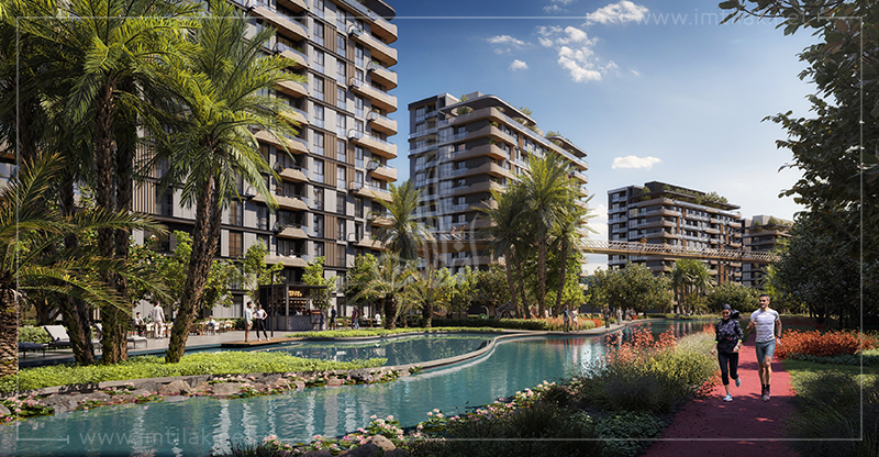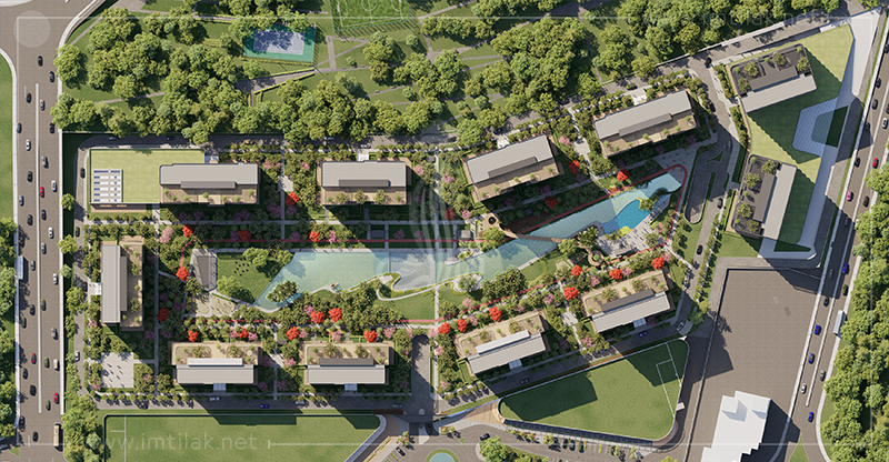- Наш проект считается одним из самых роскошных и лучших зеленых проектов в своем районе благодаря просторным зеленым насаждениям и богатому саду, включающему более 40 различных видов растений, а также искусственному озеру протяженностью более 200 метров, а к проекту примыкает фруктовый сад площадью около 43 акров.
