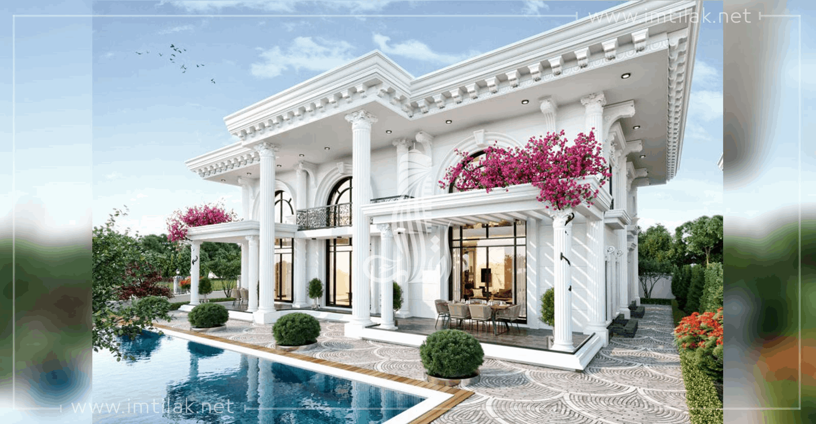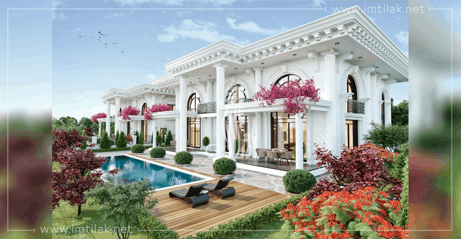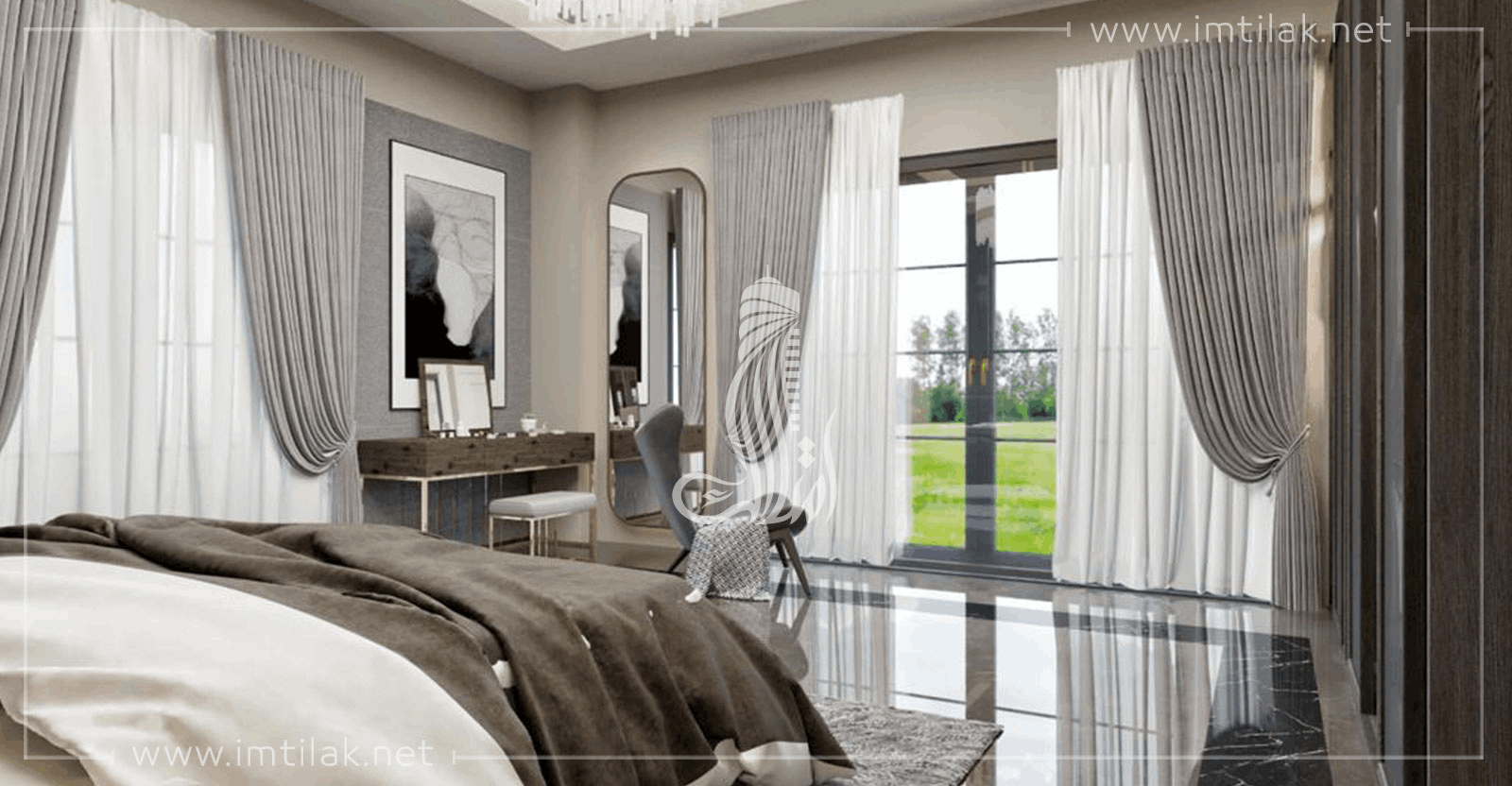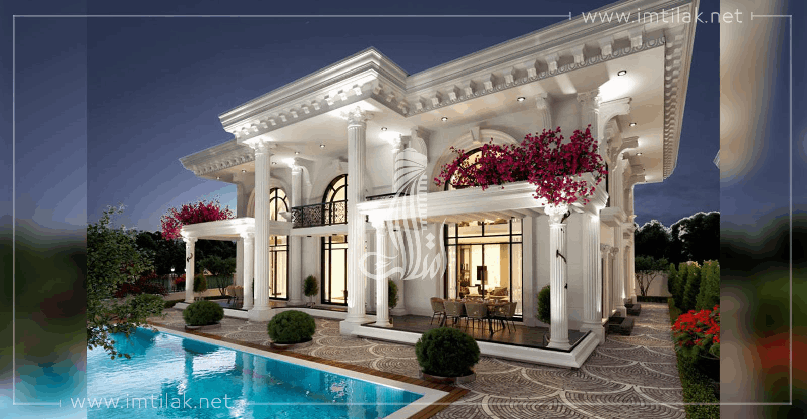 - كل فيلا مؤلفة من 8 غرف، وصالتين، ومطبخين، و 8 حمامات، وغرفة للخدم.