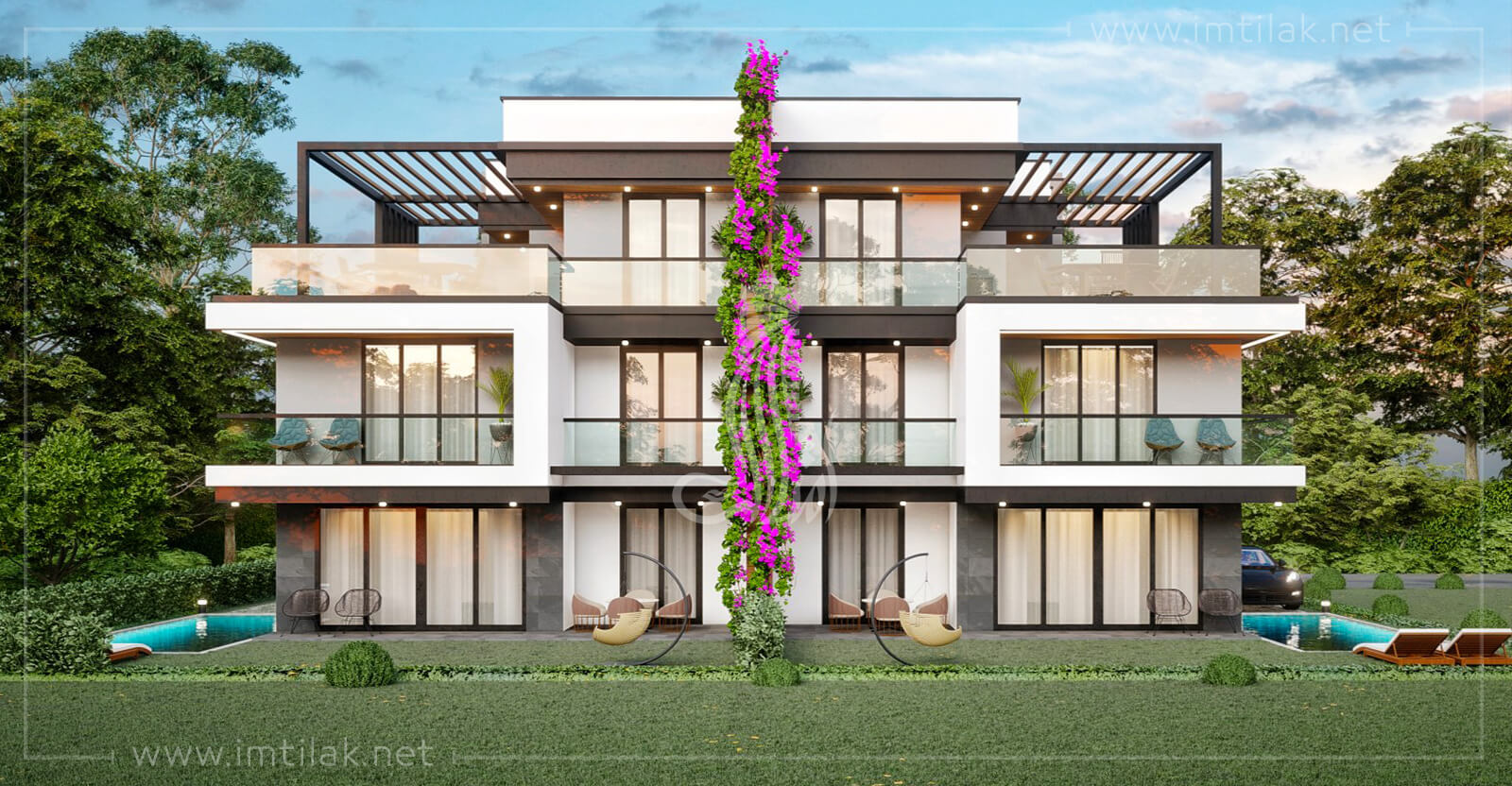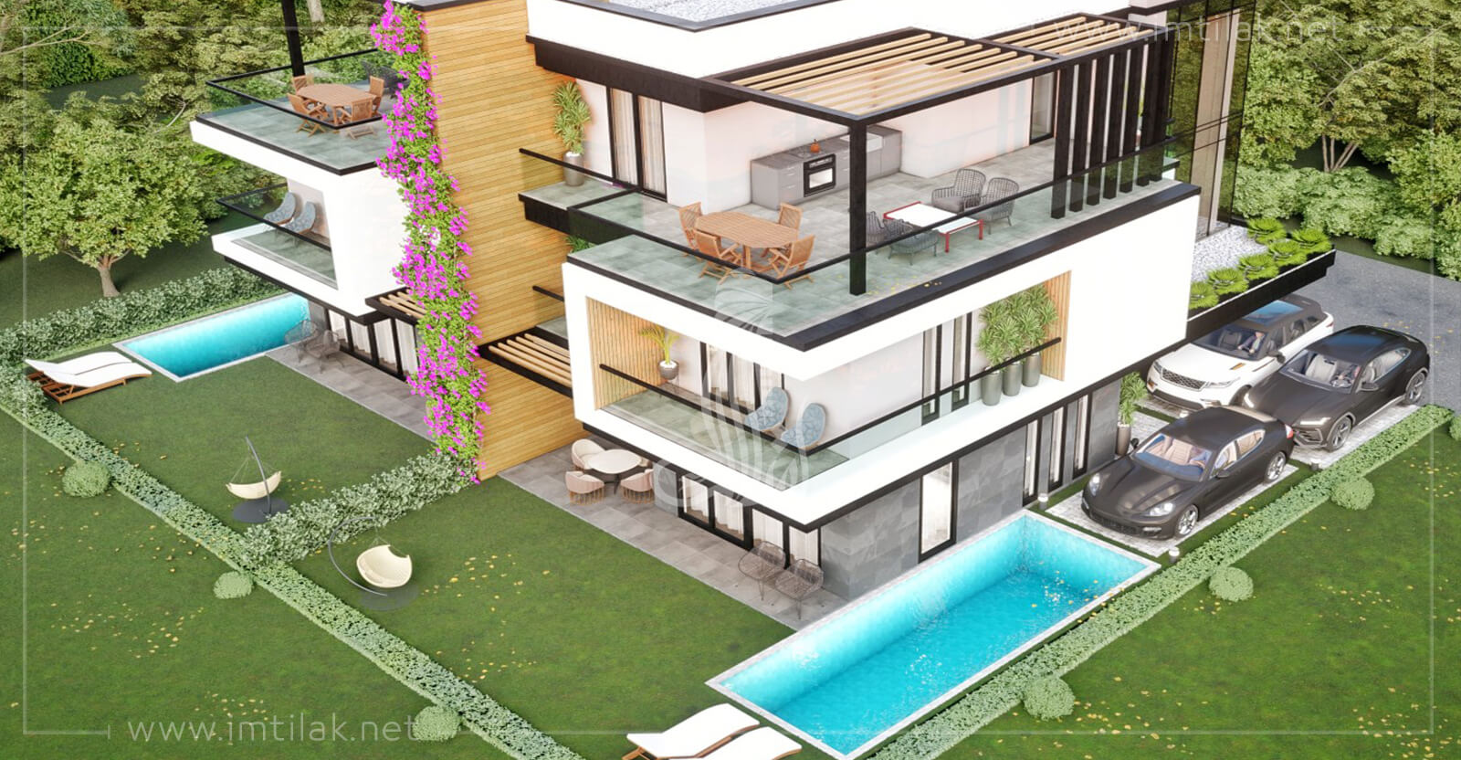 - Частная парковка для каждой виллы, вмещающая не менее двух автомобилей с террасами для отдыха и отдыха и зимними садами, а также ряд дополнительных удобств.