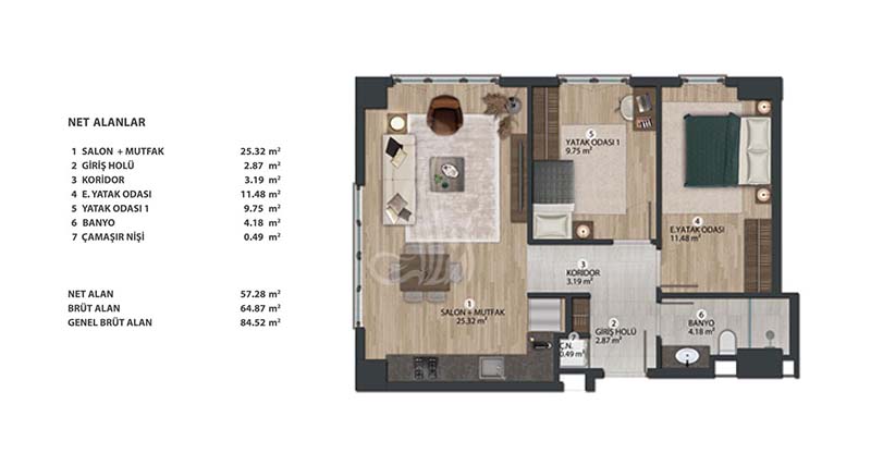 - Proje, aile yaşamına uygun 1+1, 2+1 ve 3+1 daire tiplerinde lüks konutlar sunmakta olup, çeşitli ihtiyaçları karşılayan farklı alan seçenekleri sunmaktadır.